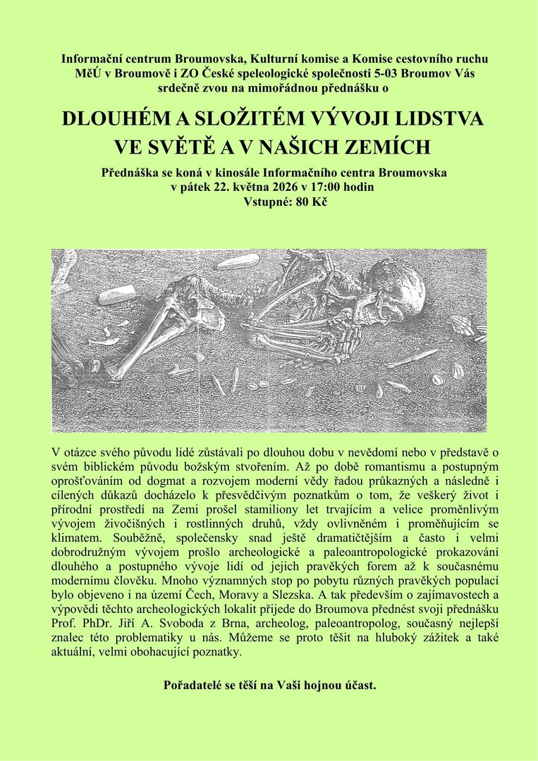 Přijďte si poslechnout aktuální a obohacující poznatky o tom, kým jsme a odkud pocházíme. Na akci vás srdečně zvou pořadatelé z IC Broumovska, Kulturní komise MěÚ a speleologické společnosti.